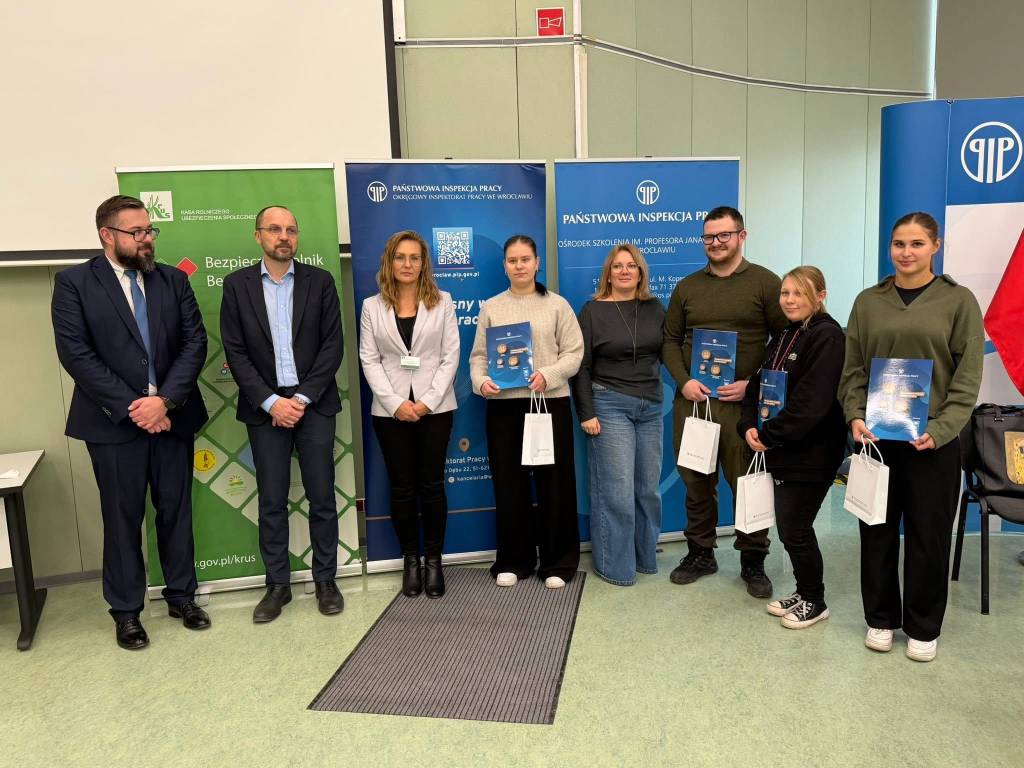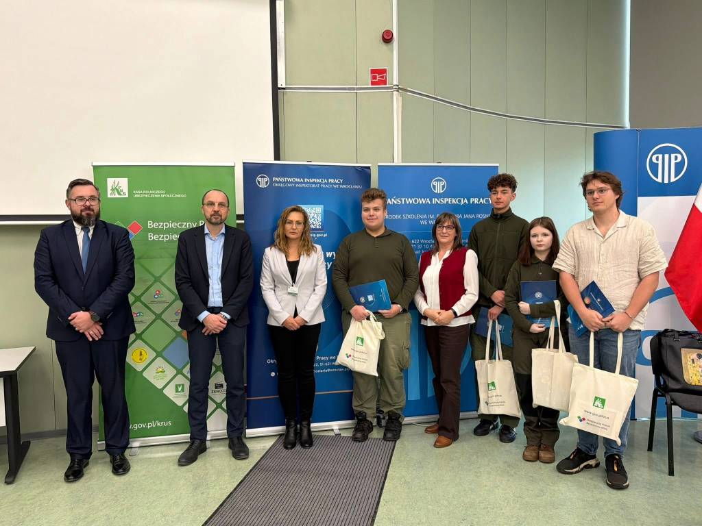 Laureaci pierwszego miejsca stojący koło przedstawicieli Okręgowego Inspektoratu Pracy we Wrocławiu oraz przedstawicielki Kasy Rolniczego Ubezpieczenia Społecznego