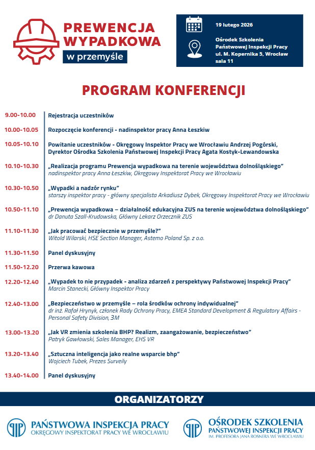 Serdecznie zapraszamy do zapisów na konferencję pn.: „Prewencja wypadkowa w przemyśle” organizowaną 19 lutego 2026 roku, przez Okręgowy Inspektorat Pracy we Wrocławiu i Ośrodek Szkolenia Państwowej Inspekcji Pracy.